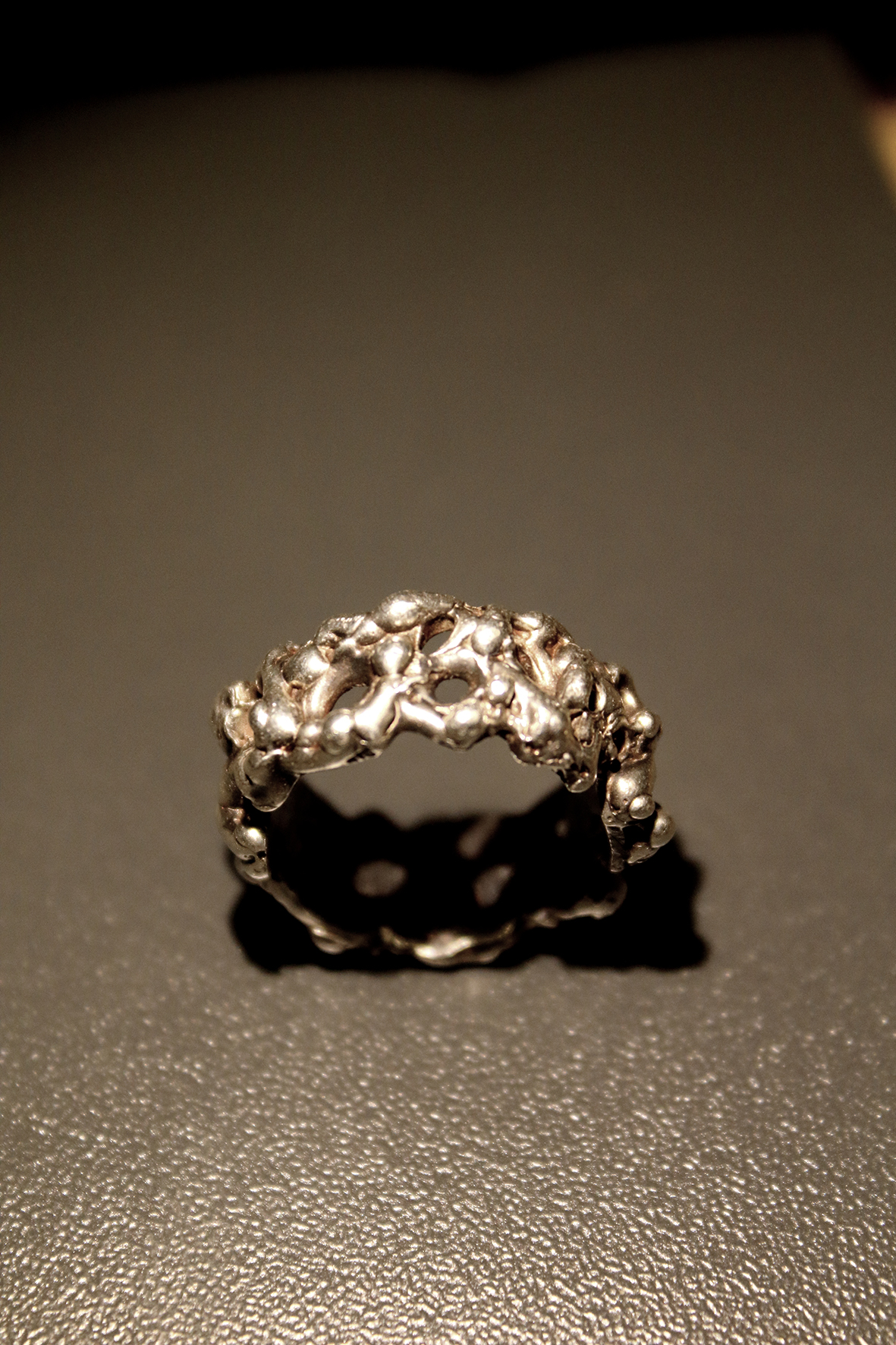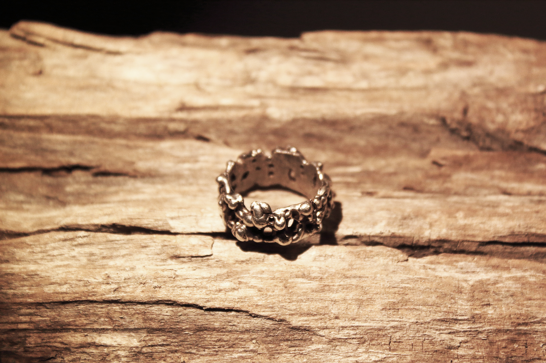 Un anello dalle forme organiche, morbide, che ricorda una pioggia battente. La leggera brunitura sottolinea l’andamento della materia enfatizzandone la trama con luci e ombre molto profonde.